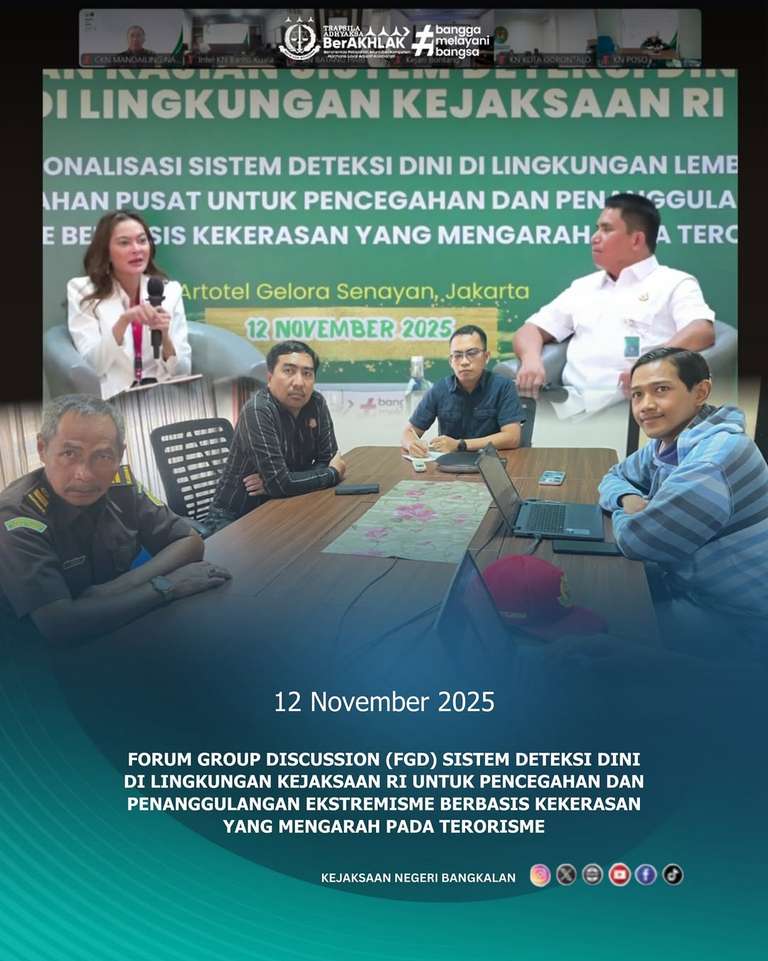 Rabu, 12 November 2025 Kasubsi II Intel Berdy Despar Magrhobi, S.H. beserta Jaksa Fungsional, dan staf mengikuti Forum Group Discussion (FGD) sistem deteksi dini di lingkungan Kejaksaan RI untuk pencegahan dan penanggulangan ekstremisme berbasis kekerasan yang mengarah pada terorisme secara virtual.