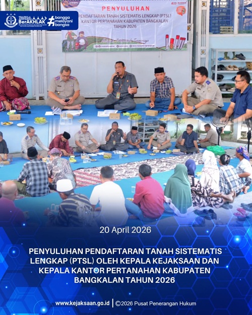 Senin, 20 April 2026 Kepala Kejaksaan Negeri Bangkalan, Noer Adi, S.H., M.H., dan Kepala Kantor Pertanahan Kabupaten Bangkalan berperan sebagai narasumber dalam kegiatan Penyuluhan Pendaftaran Tanah Sistematis Lengkap (PTSL) Tahun 2026 bertempat di Ds. Kompol, Kec. Geger, Kab. Bangkalan. Penyuluhan ini bertujuan untuk meningkatkan pemahaman masyarakat mengenai aspek hukum dalam pendaftaran tanah secara sistematis dan menyeluruh.